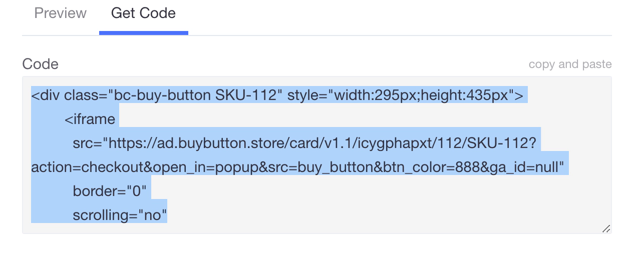 Once you’re happy with your Buy Button for your product in the preview, navigate to the get code screen and copy the snippet provided to your clipboard: