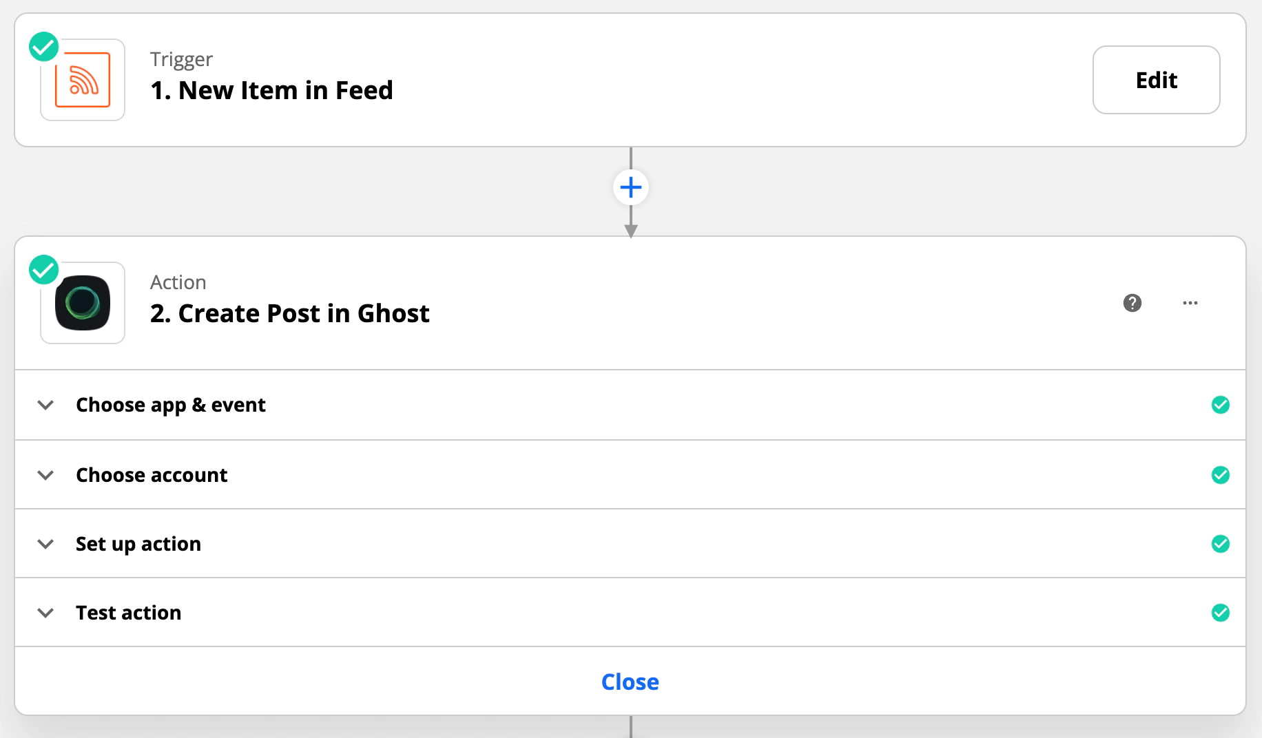Then, use the Create post in Ghost action step, and setup the action using the data fields provided: